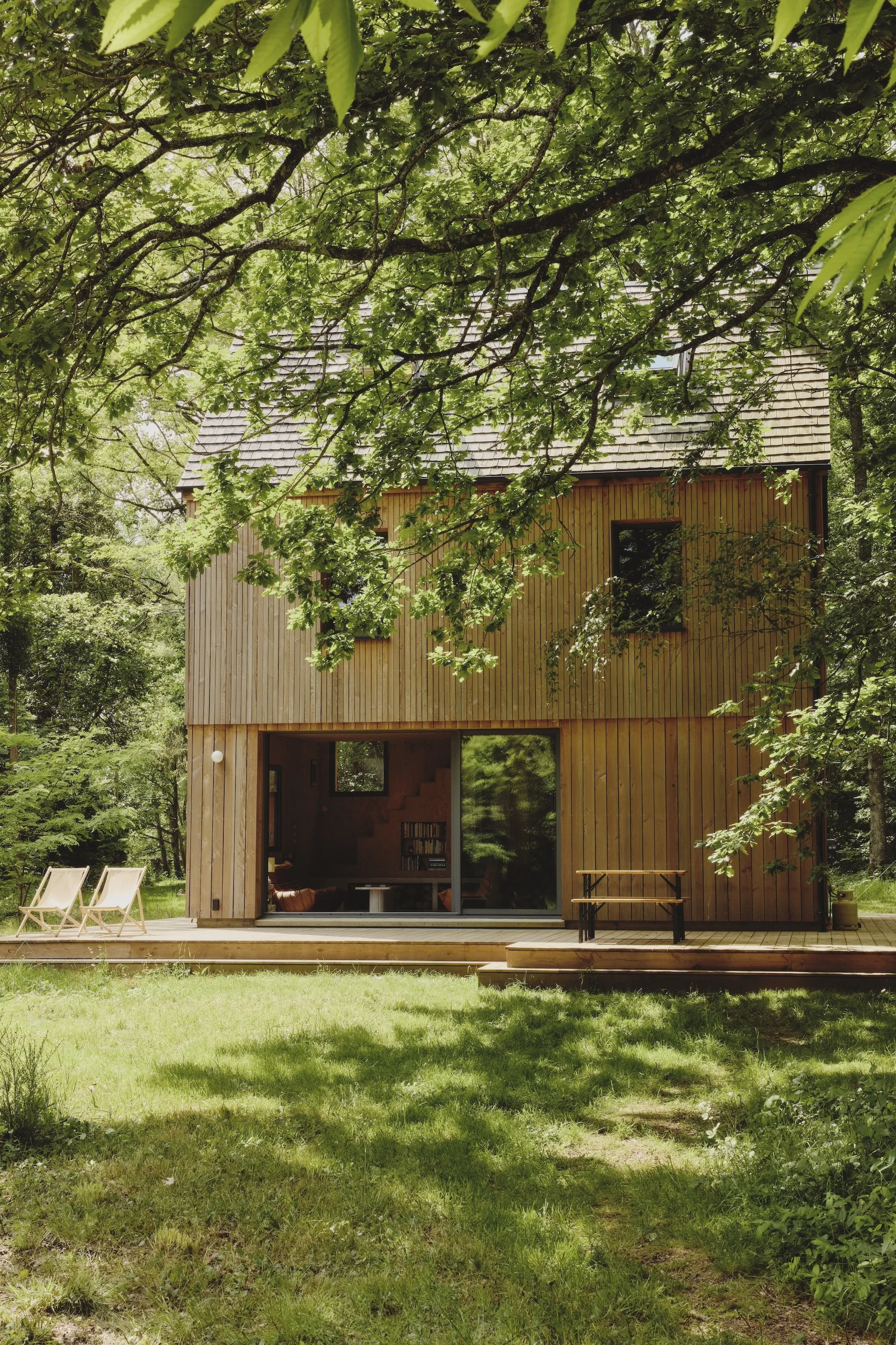 Maison Sauvage is set in a wood of chestnut, oak and birch trees, adjacent to a large forest. It's made of wood, from the structure to the tiles and the insulation. Its design was conceived to blend in with and sublimate nature. You can watch the many birds that occupy the nesting houses, and if you're lucky, catch a glimpse of deer passing through the garden.